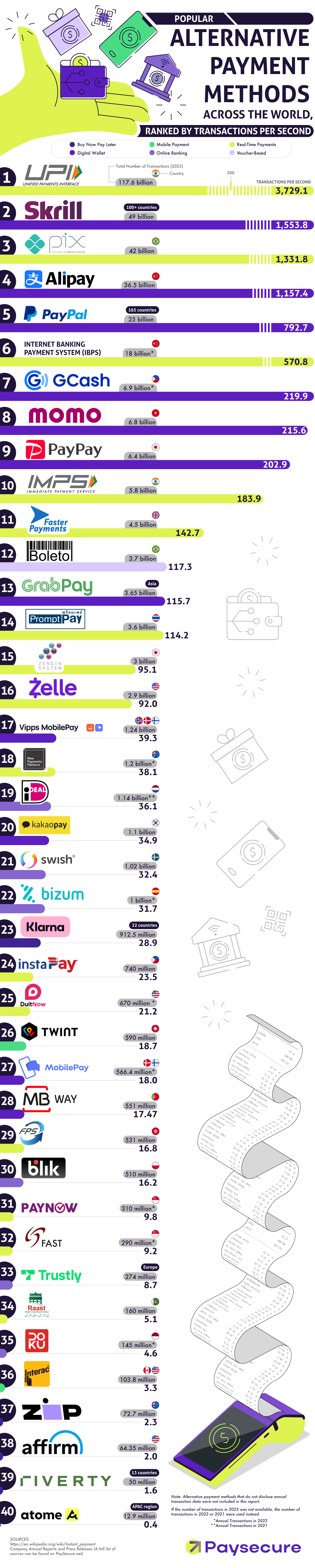 Nearly every country uses some form of alternative payment, with many central banks even creating their own real-time payment options to allow more citizens the ability to make payments and transfer money online. Diversifying payment options is beneficial to society as it enables banking to become accessible to even the most remote people. To put the worldwide rise to prominence of alternative payment methods into perspective, the Paysecure team examined 40 of the top alternative payment methods from around the world to reveal how many transactions they processed every second over the past year. Read on for the findings of our study: